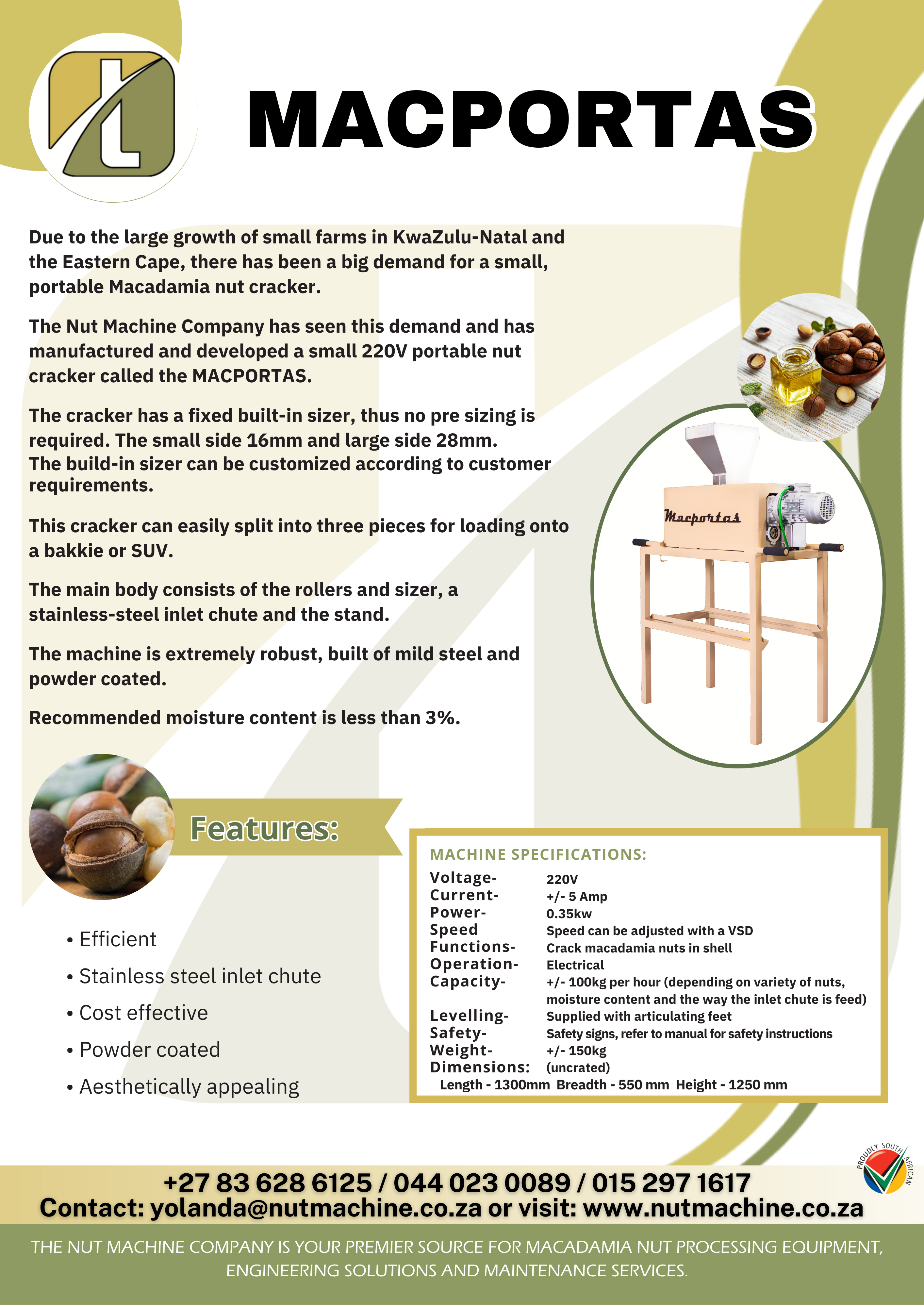 The Nut Machine Company has seen this demand and has manufactured and developed a small 220V portable nut cracker called the MACPORTAS.