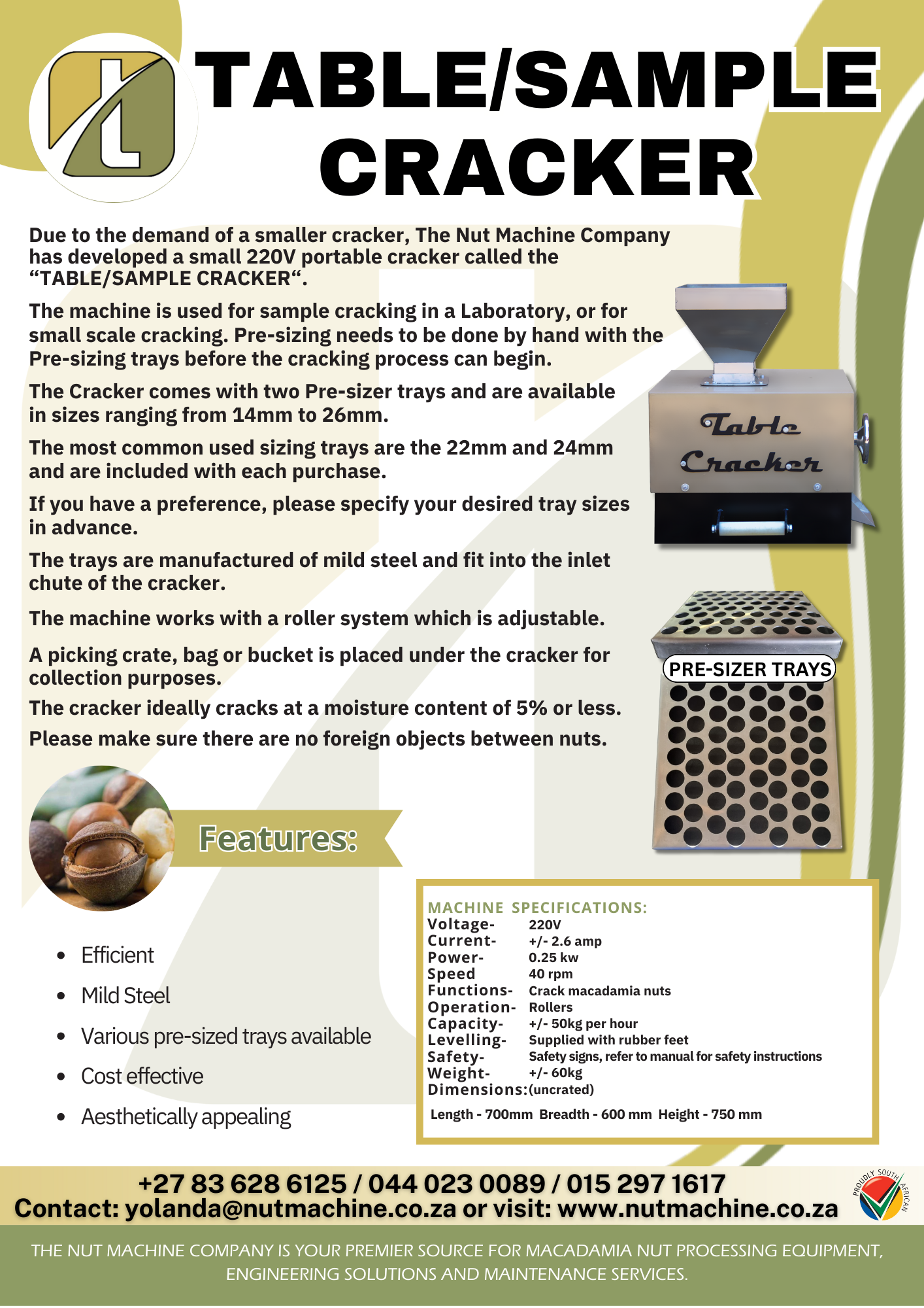Due to the demand of a smaller cracker, The Nut Machine Company has manufactured a small 220V portable cracker called the “TABLE CRACKER”
