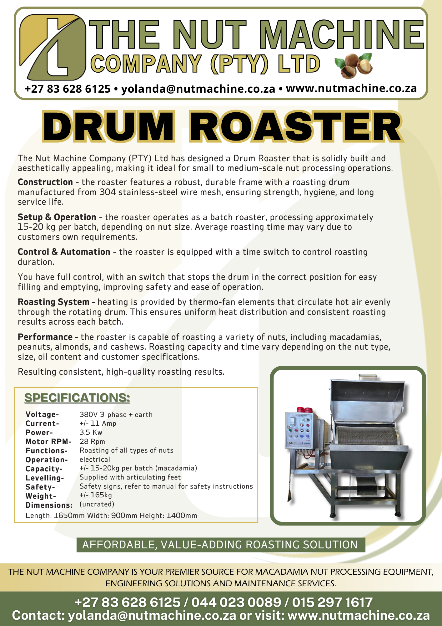 The Nut Machine Company (PTY) Ltd has designed a Drum Roaster that is solidly built and aesthetically appealing, making it ideal for small to medium-scale nut processing operations.